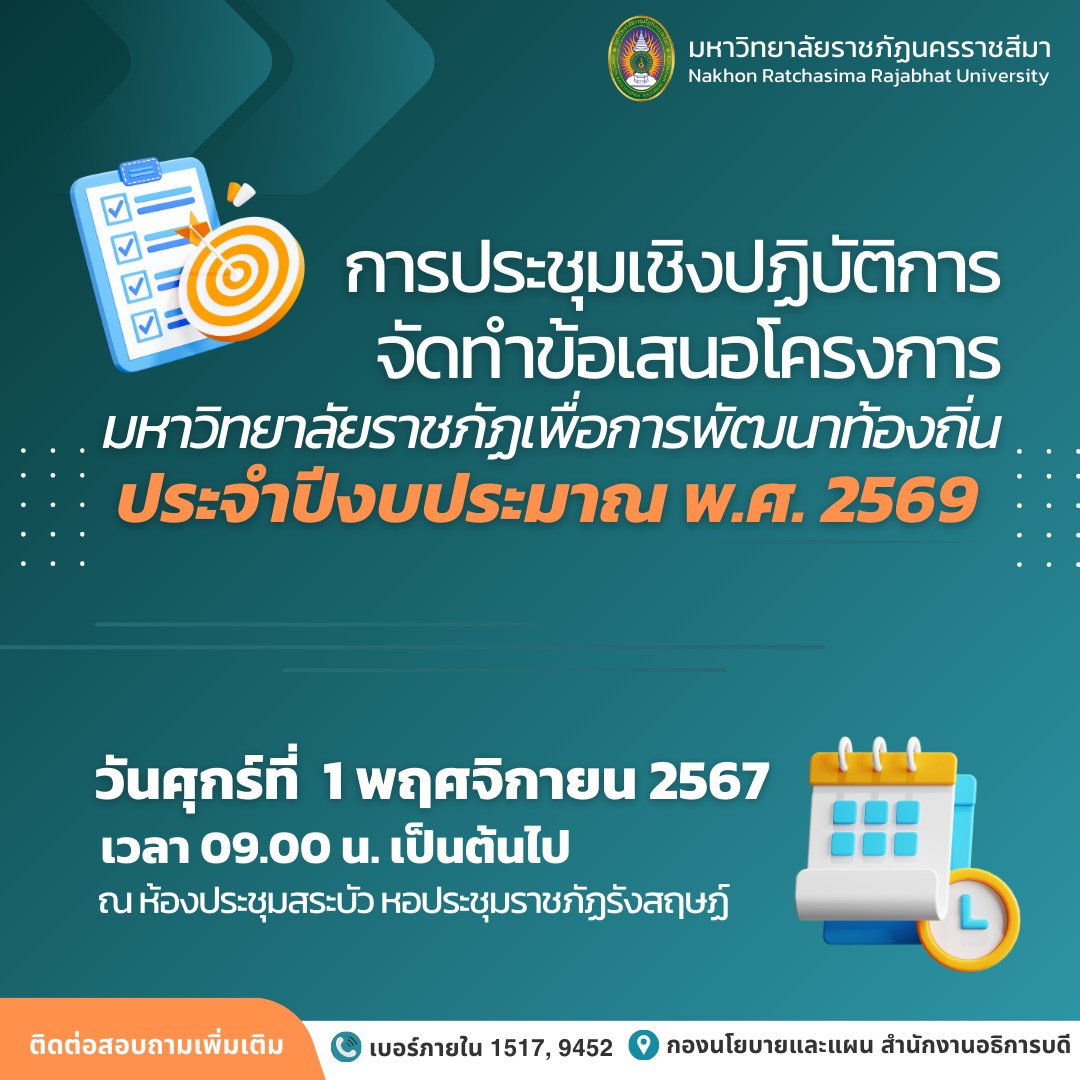กองนโยบายและแผน จัดประชุมเชิงปฏิบัติการจัดทำข้อเสนอโครงการมหาวิทยาลัยราชภัฏเพื่อการพัฒนาท้องถิ่น ประจำปีงบประมาณ พ.ศ. 2569 ในวันศุกร์ที่ 1 พฤศจิกายน พ.ศ.2567 ณ ห้องประชุมสระบัว หอประชุมราชภัฏรังสฤษฏ์ โดยมีกลุ่มเป้าหมายผู้เข้าร่วมคือ คณะกรรมการบริหารมหาวิทยาลัย ผู้บริหารและบุคลากรของคณะ/หน่วยงาน