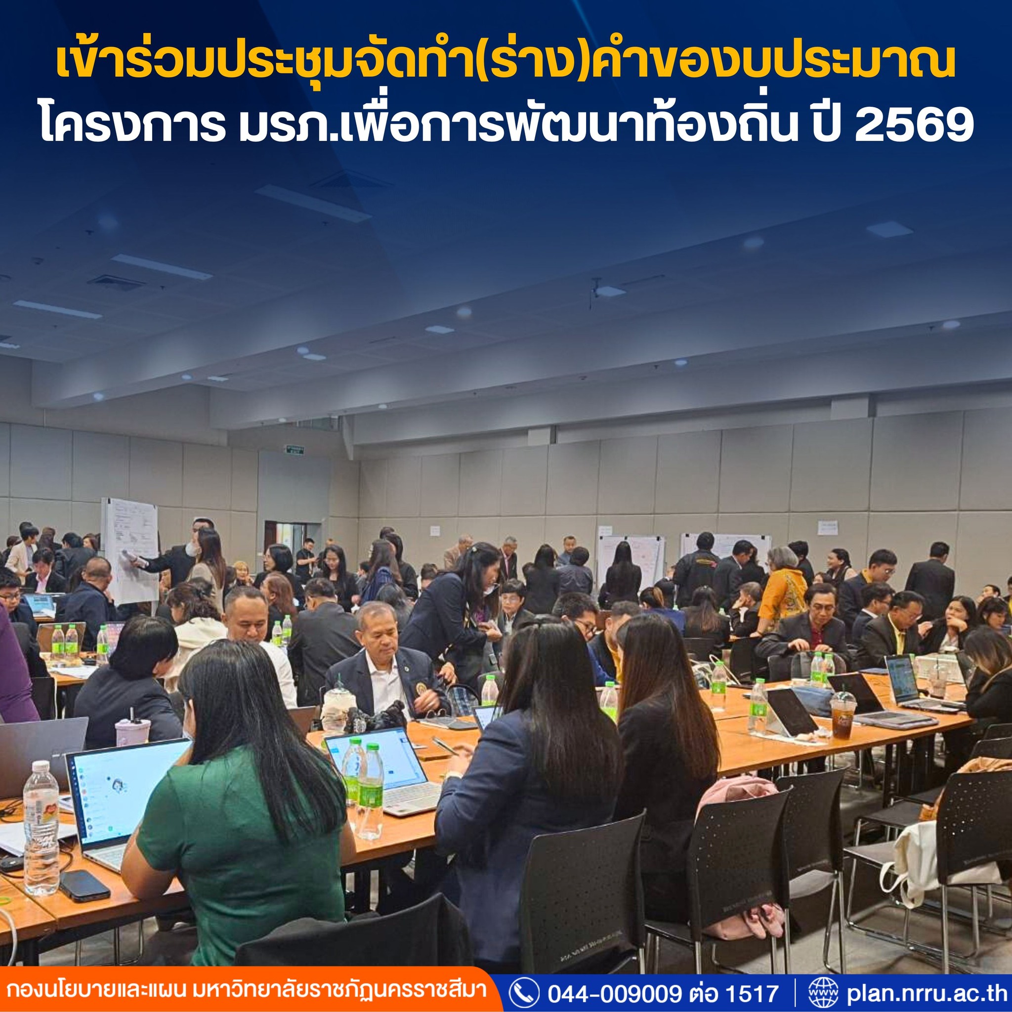 วันที่ 12-13 พฤศจิกายน พ.ศ. 2567 ผู้บริหารและบุคลากรมหาวิทยาลัยราชภัฏนครราชสีมา เข้าร่วมประชุมเชิงปฏิบัติการจัดทำ (ร่าง) คำของบประมาณแผ่นดิน โครงการมหาวิทยาลัยราชภัฏเพื่อการพัฒนาท้องถิ่น ประจำปี งบประมาณ พ.ศ. 2569 ณ มหาวิทยาลัยราชภัฏพระนคร กรุงเทพมหานคร โดยมีผู้แทนอธิการบดี รองอธิการบดีฝ่ายวางแผน ผู้อำนวยการกองนโยบายและแผน ดร.นงรัตน์ อิสโร ที่ปรึกษา ทปอ.มหาวิทยาลัยราชภัฏ และผู้บริหารที่เกี่ยวข้อง ของมหาวิทยาลัยราชภัฏทั่วประเทศ ทั้ง 38 แห่ง เข้าร่วมประชุมระดมสมองจัดทำและเสนอโครงการพัฒนาท้องถิ่น ประกอบด้วย โครงการร่วมระดับประเทศ 1 โครงการ โครงการร่วมระดับภูมิภาค ๆ ละ 1 โครงการ และโครงการย่อยตามแพลทฟอร์มการพัฒนาของแต่ละมหาวิทยาลัย