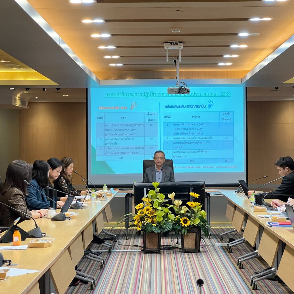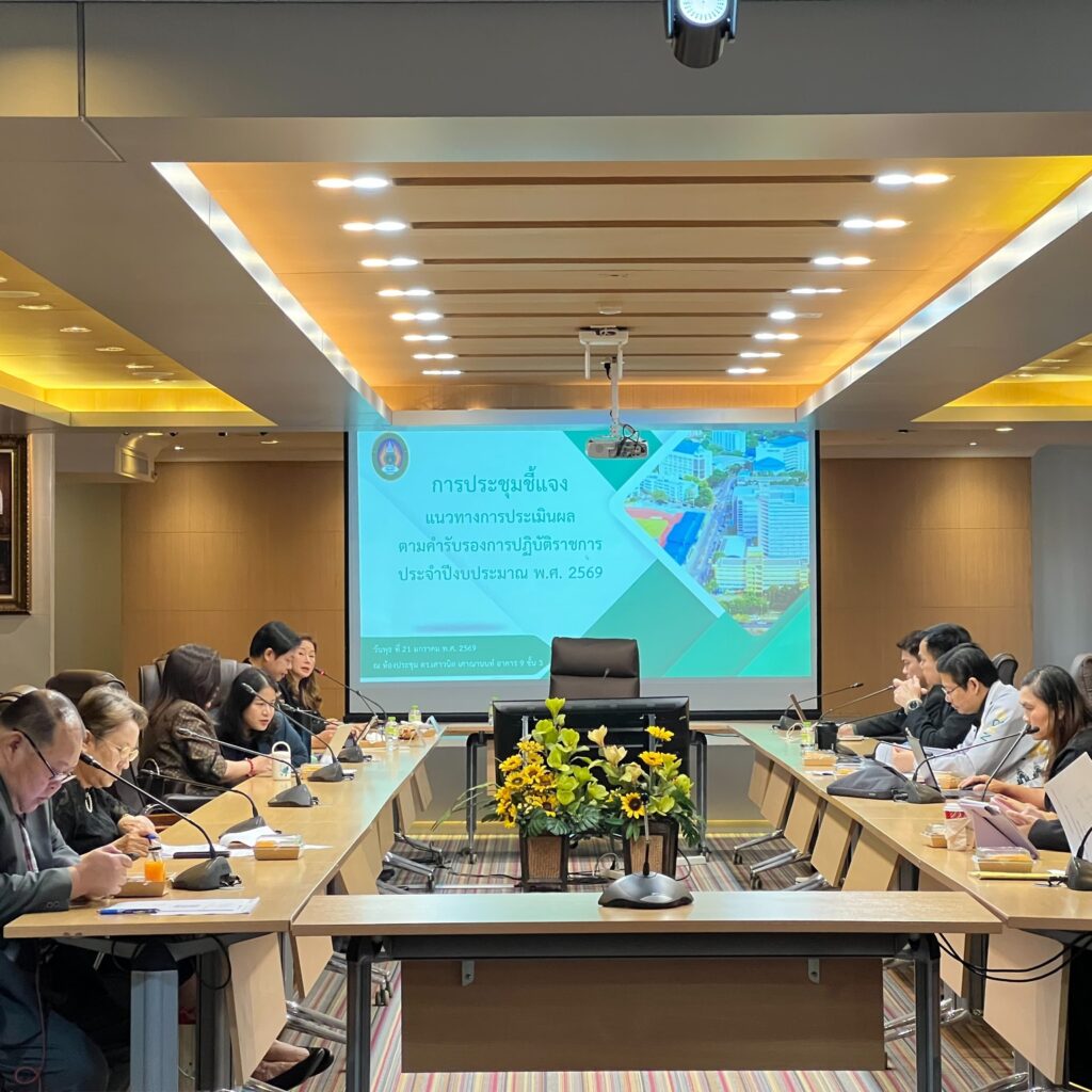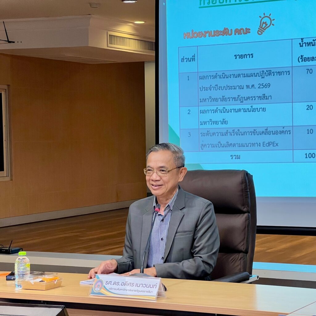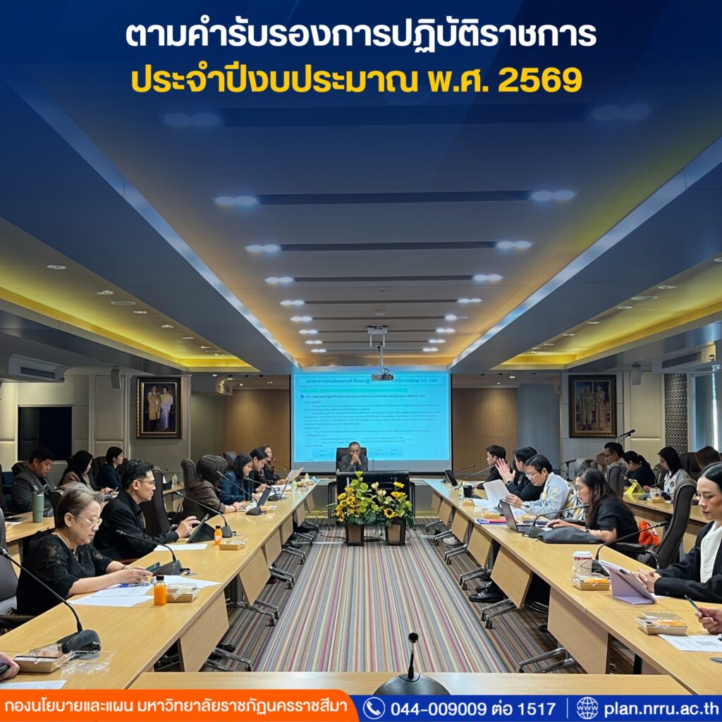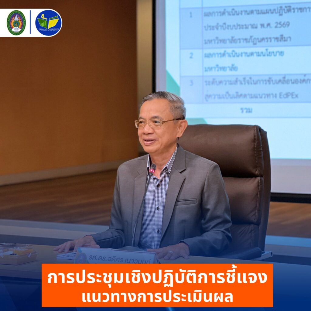 วันพุธที่ 21 มกราคม 2569 มหาวิทยาลัยราชภัฏนครราชสีมา โดยกองนโยบายและแผน จัดประชุมชี้แจงแนวทางการประเมินผลตามคำรับรองการปฏิบัติราชการ ประจำปีงบประมาณ พ.ศ. 2569 ณ ห้องประชุม ดร.เศาวนิต เศาณานนท์ อาคาร 9 ชั้น 3 โดยได้รับเกียรติจาก รศ.ดร.อดิศร เนาวนนท์ อธิการบดี เป็นประธานกล่าวเปิดการประชุม ดำเนินการประชุมโดย ผศ.สุธีรา เข็มทอง รองอธิการบดีฝ่ายแผน งบประมาณและพัฒนาคุณภาพ